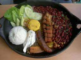 - El plato antioqueño más célebre es la Bandeja Paisa, considerada por una importante corriente de opinión del país como plato nacional de Colombia. En su versión más clásica se compone por lo general de fríjoles acompañados con arroz, carne en polvo, chicharrón, chorizo, morcilla, patacones, tajadas fritas de plátano maduro, un huevo frito, tajadas detomate grande maduro y rojo, aguacate, arepa y hogao. Toda la bandeja paisa gira alrededor de los fríjoles cargamanto. Dado su gran tamaño se sirve en una bandeja, pues por ningún motivo cabría en un plato corriente. En ausencia de bandeja hay que servirlo en varios platos y recipientes normales grandes.